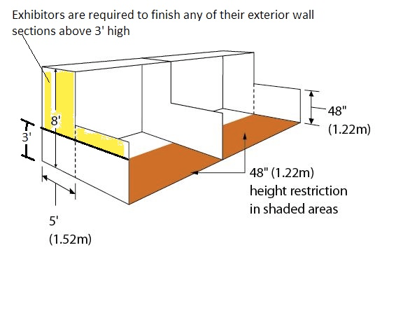 For spaces 10′ in depth, sidewalls and display materials may extend no more than 5′ from the back at a maximum height of 8′. For the remaining 5′ to the aisle, sidewalls and display materials cannot exceed 4′ in height. For 8′ deep booths, an 8′ sidewall can come out 4′ from the back and for 5′ deep booths, they can come out a distance of 3′.